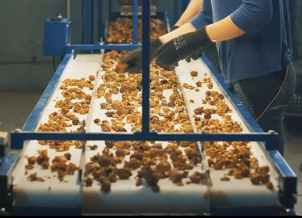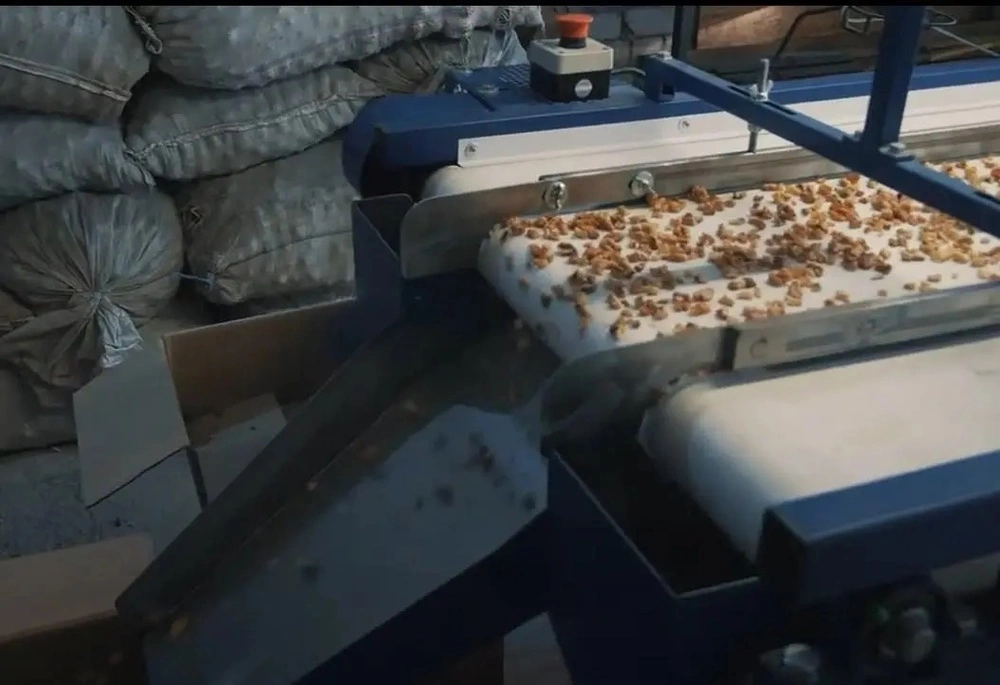 Інспекційний стрічковий конвеєр з бункером та електромагнітним живильником призначений для інспекції та сортування горіхів, овочів, фруктів та ягід.